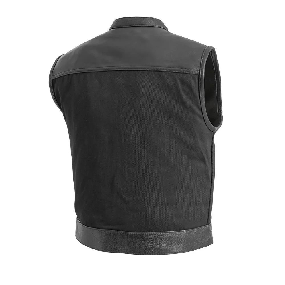Club style vest with one-inch collar, covered snaps and hidden cropped center zipper.